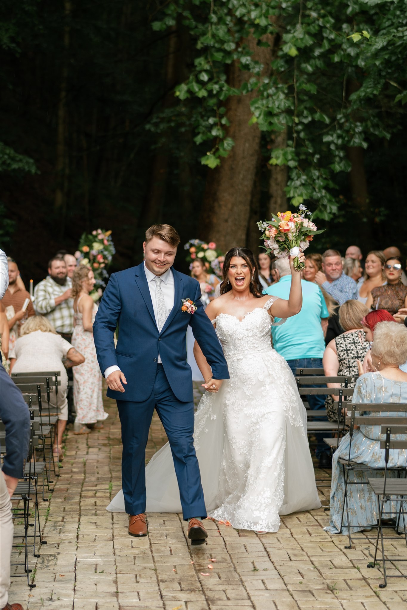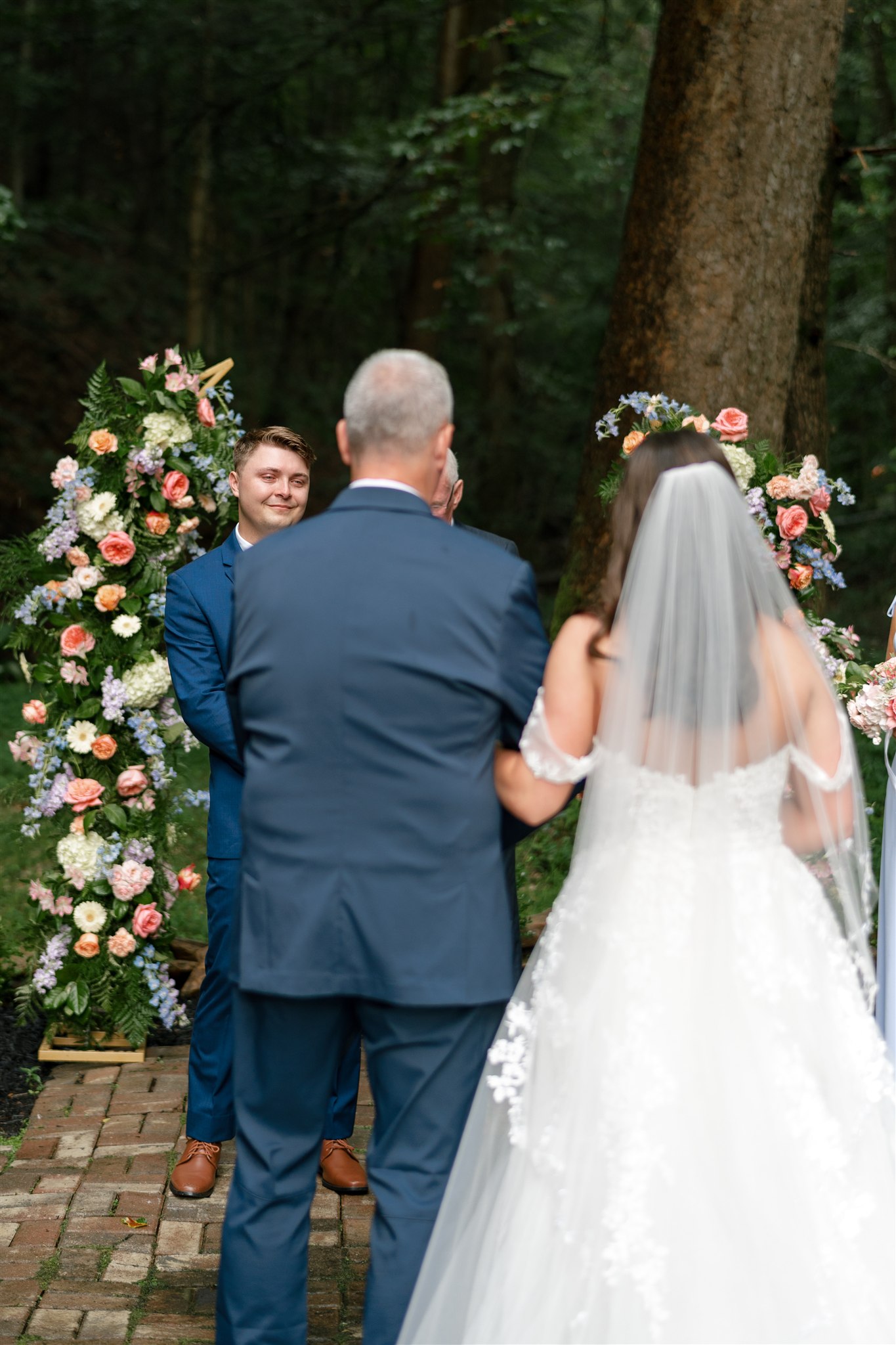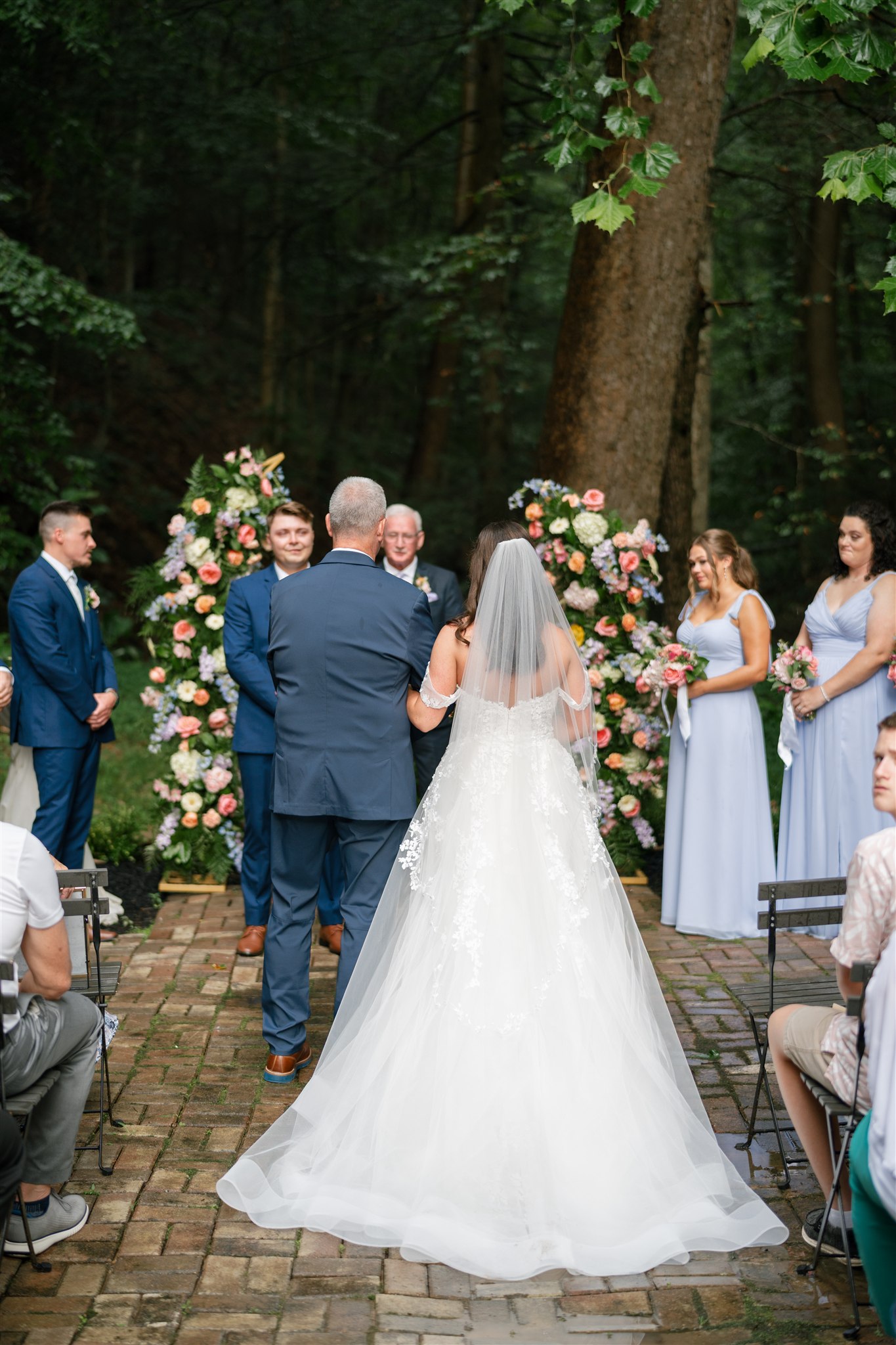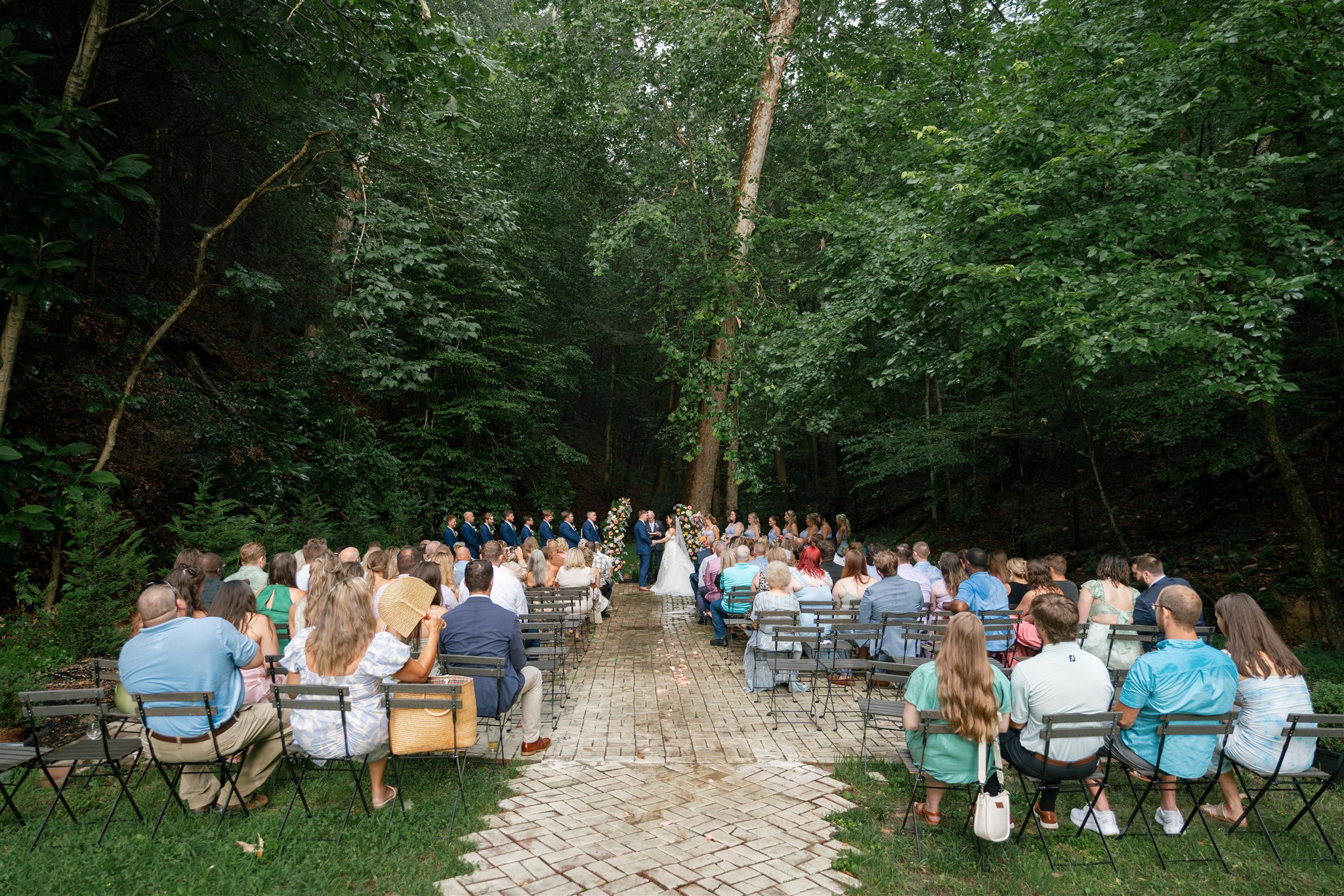 The day itself was absolutely gorgeous. Just before the ceremony, we experienced a quick downpour of rain. Rather than stress, everyone took a breath and waited it out together. As luck would have it, the rain passed quickly, leaving behind the richest green tones throughout the forest. When Hannah finally walked down the aisle, she did so surrounded by lush trees and softened light, and it was nothing short of magical.