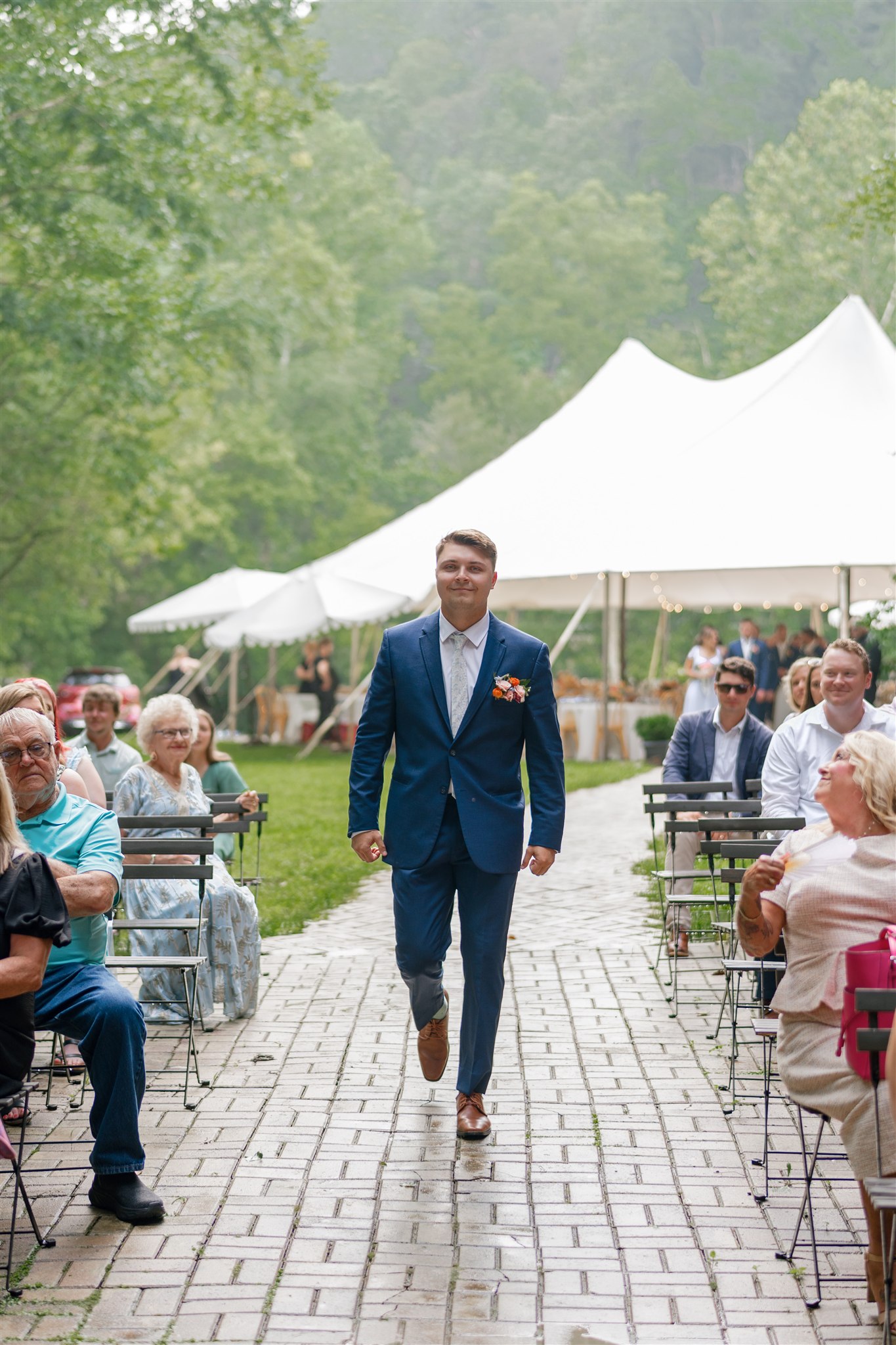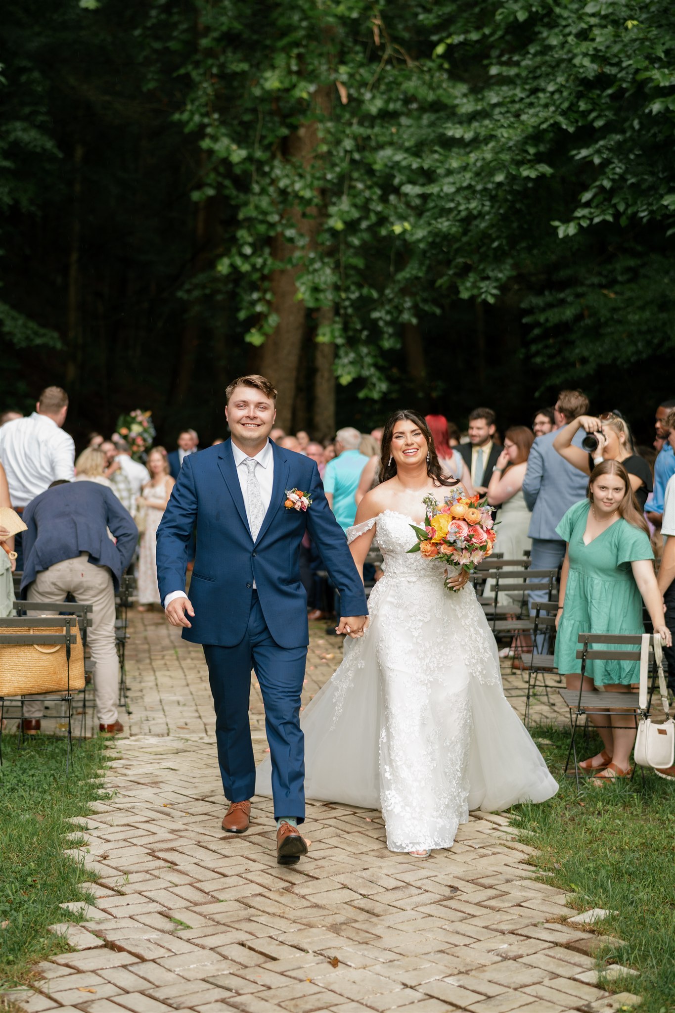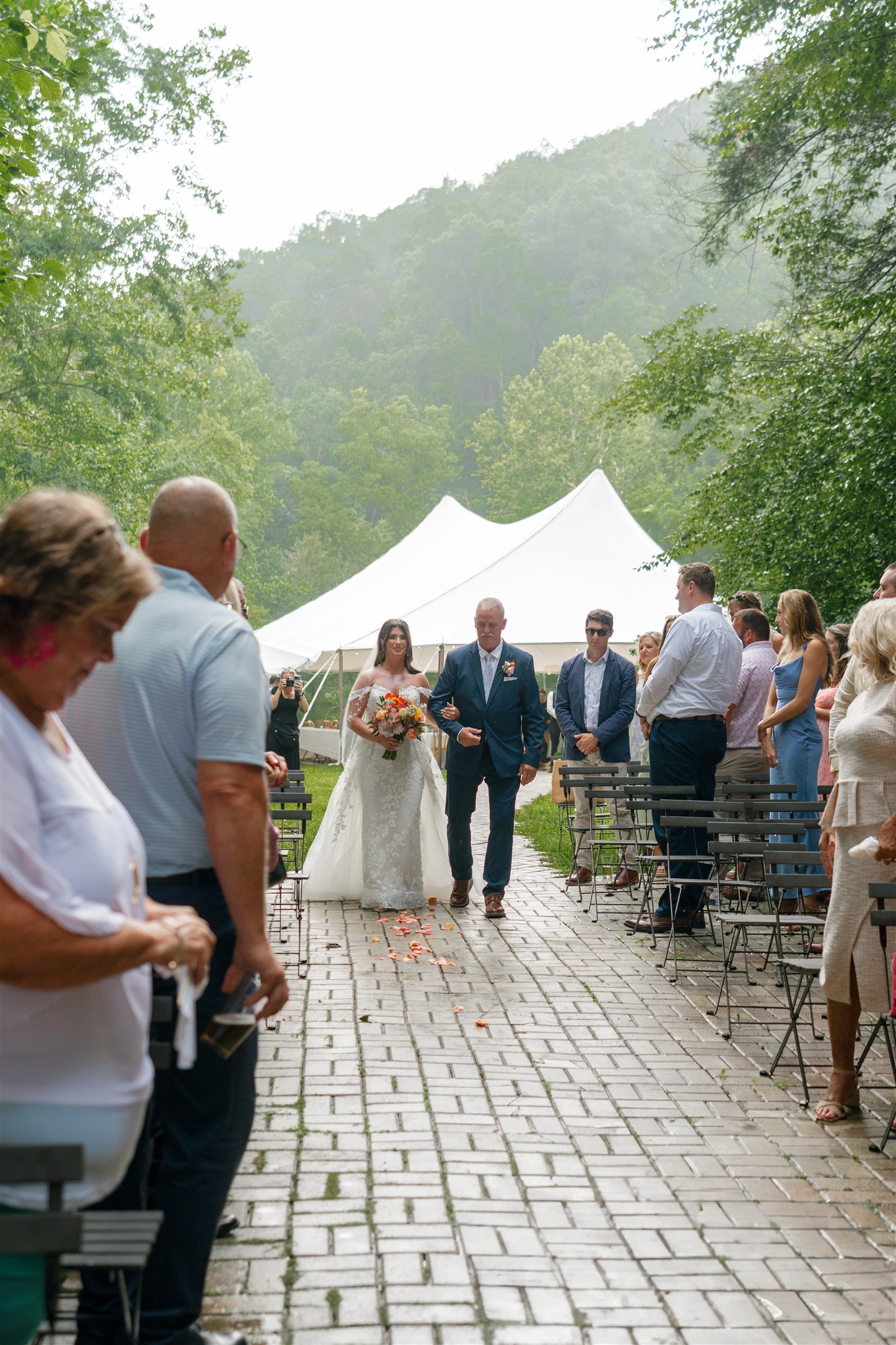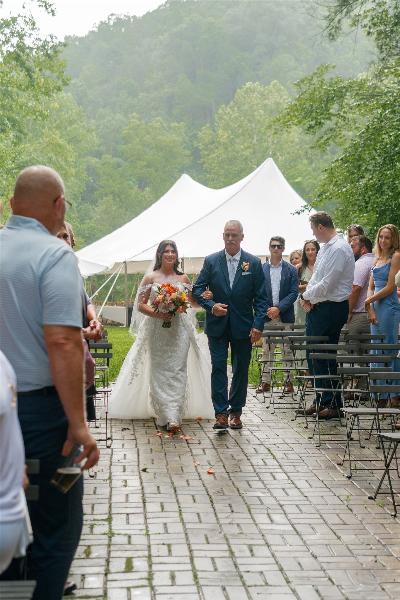 The day itself was absolutely gorgeous. Just before the ceremony, we experienced a quick downpour of rain. Rather than stress, everyone took a breath and waited it out together. As luck would have it, the rain passed quickly, leaving behind the richest green tones throughout the forest. When Hannah finally walked down the aisle, she did so surrounded by lush trees and softened light, and it was nothing short of magical.