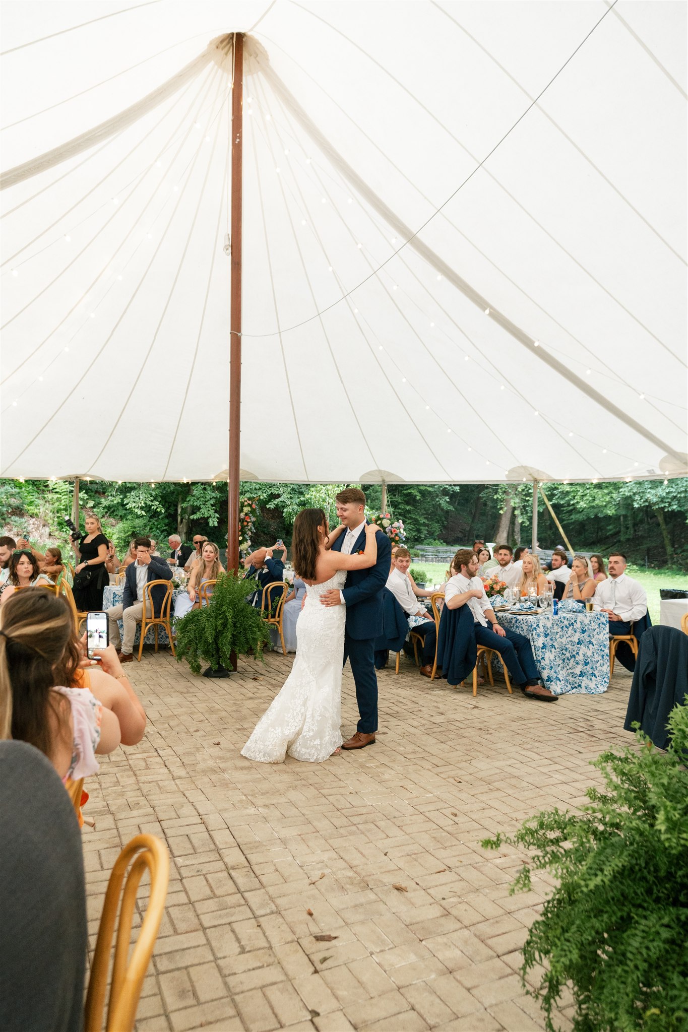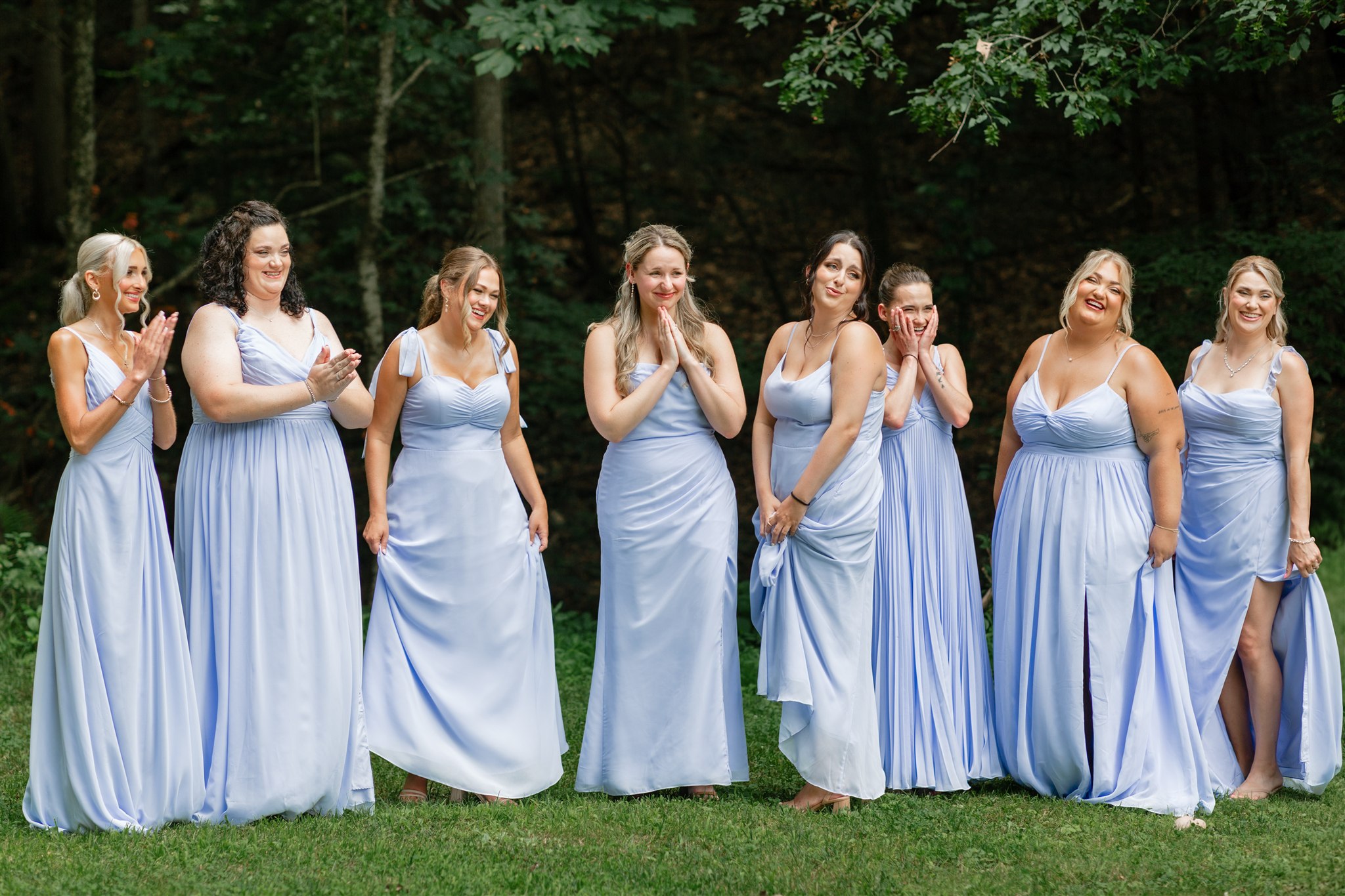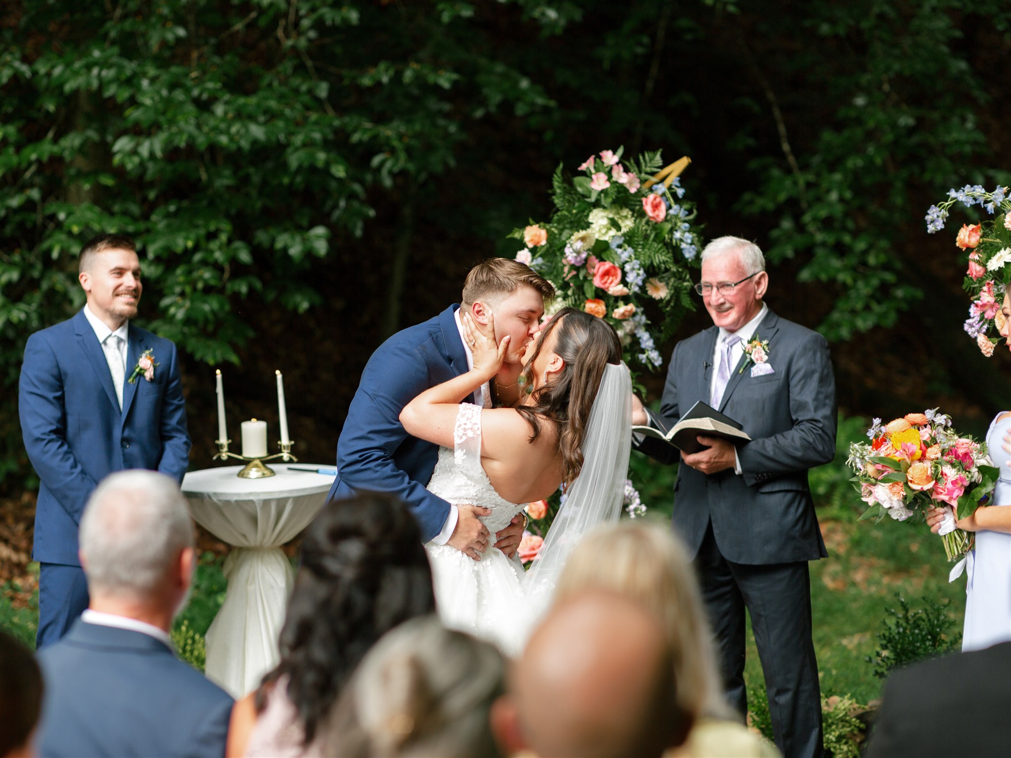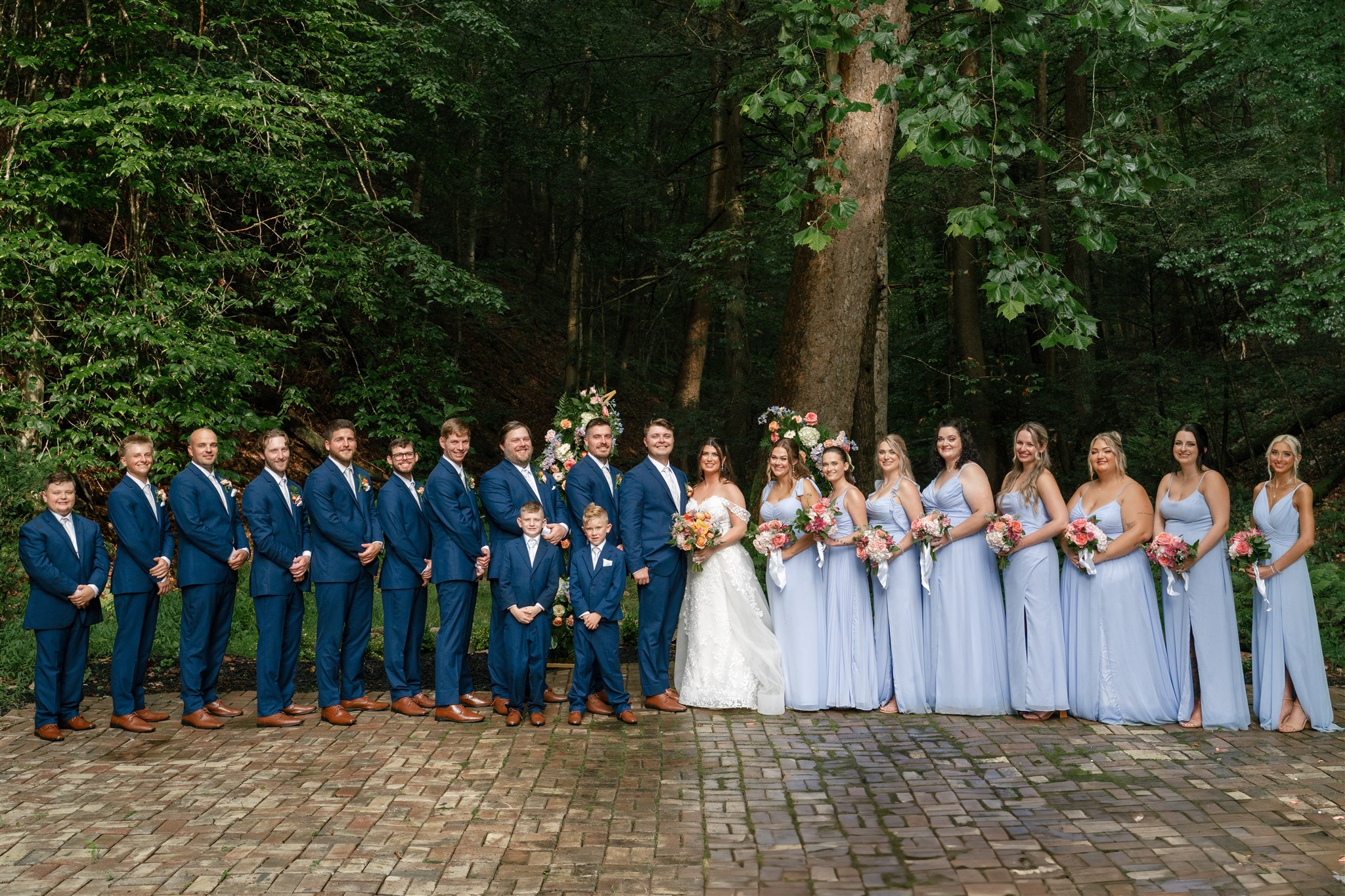 The day itself was absolutely gorgeous. Just before the ceremony, we experienced a quick downpour of rain. Rather than stress, everyone took a breath and waited it out together. As luck would have it, the rain passed quickly, leaving behind the richest green tones throughout the forest. When Hannah finally walked down the aisle, she did so surrounded by lush trees and softened light, and it was nothing short of magical.
