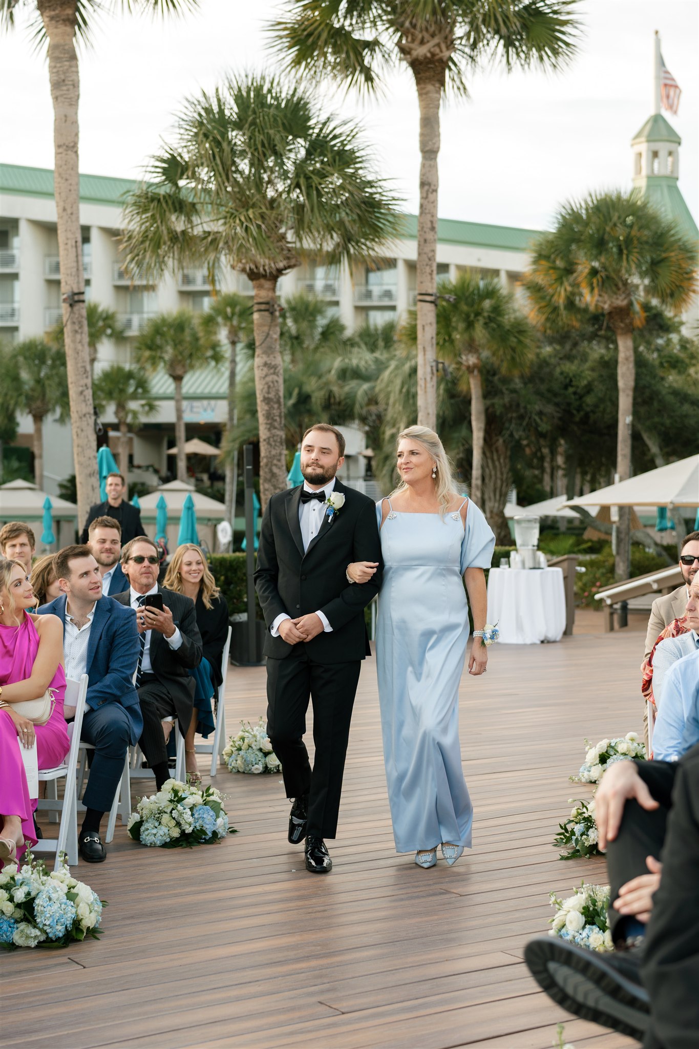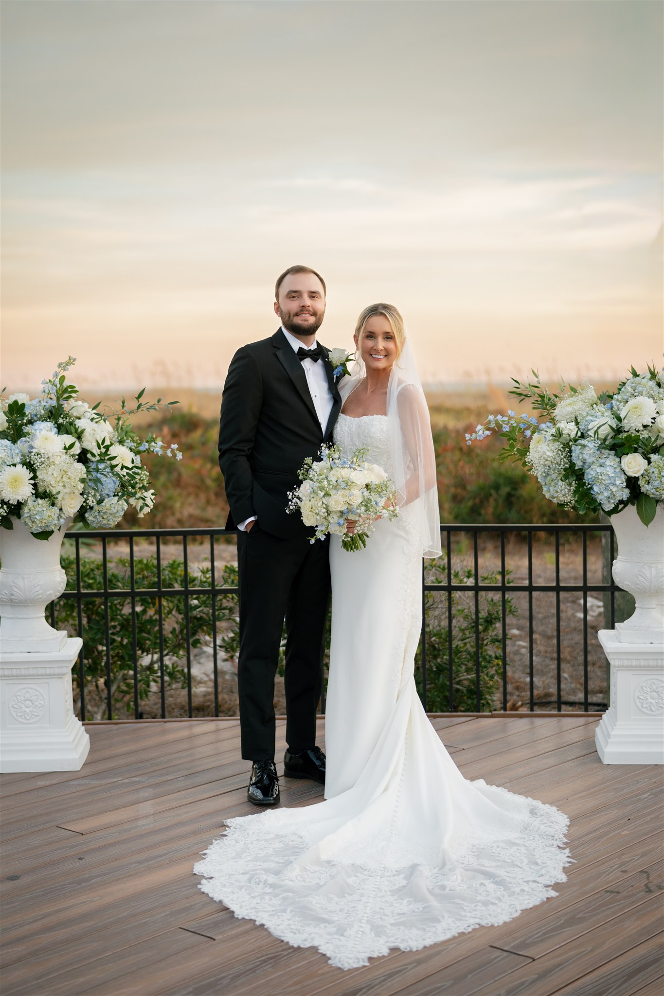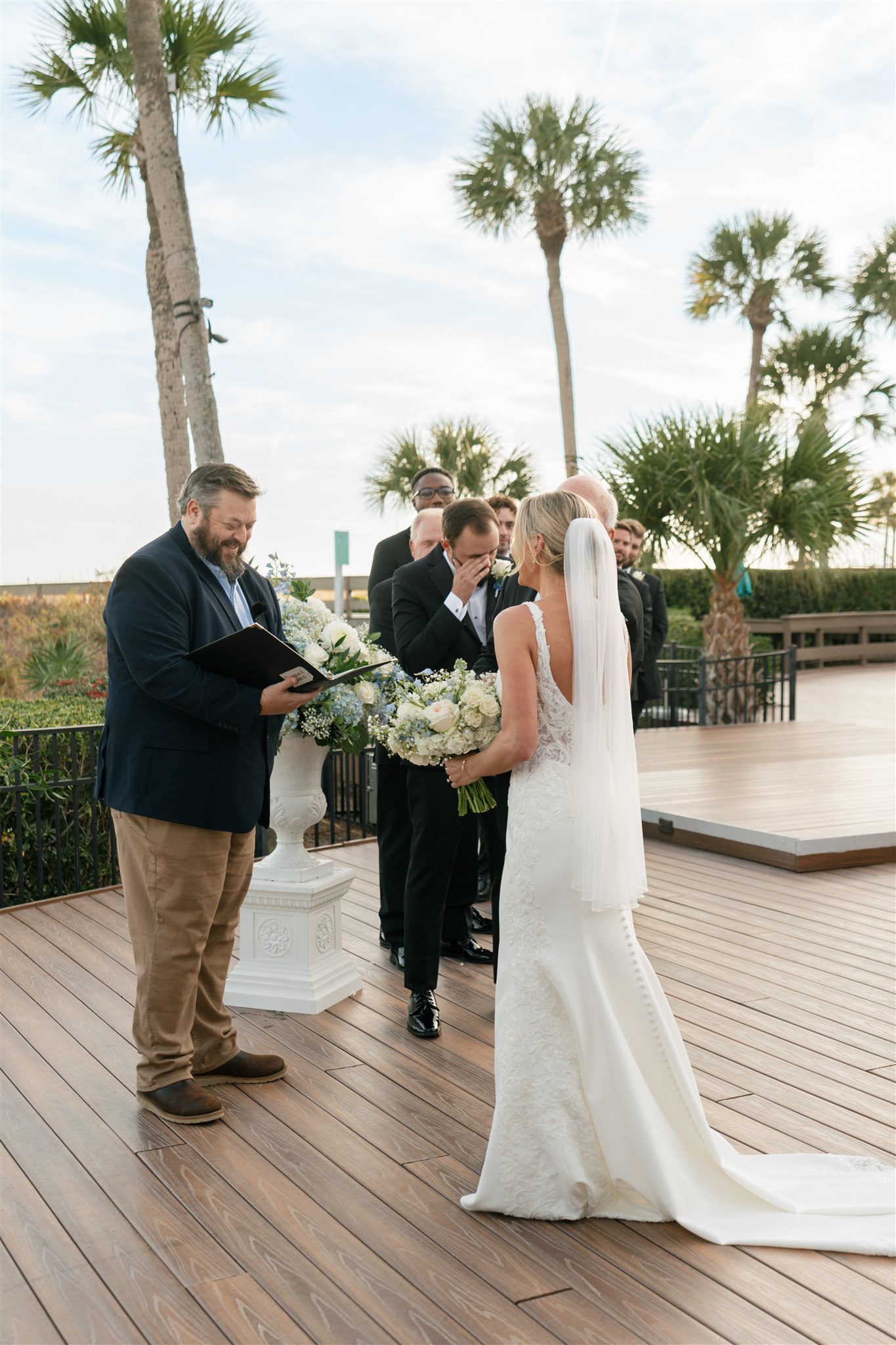 Their ceremony took place on the oceanfront deck overlooking the beach, and it could not have been more perfect. The weather was absolutely beautiful, with a soft coastal breeze and golden light setting the scene as they exchanged vows. It was heartfelt, emotional, and deeply personal. The kind of ceremony that reminds you what it’s all about.